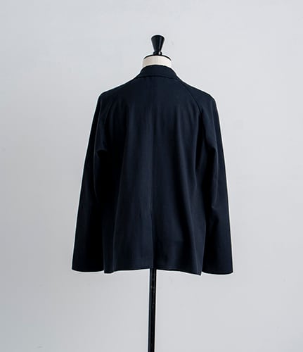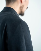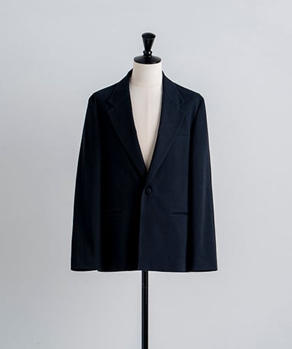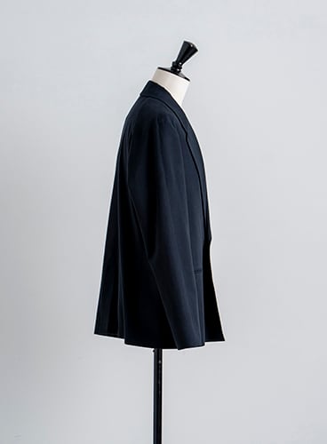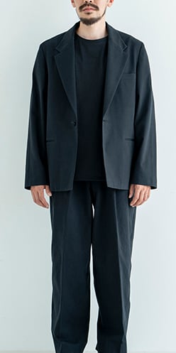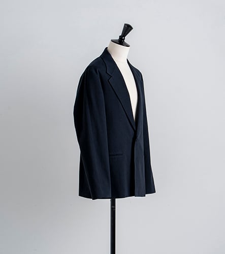 襟はアンイーブンジャケットよりも少しボリュームを持たせ、スタイリッシュよりもカジュアルな雰囲気に。